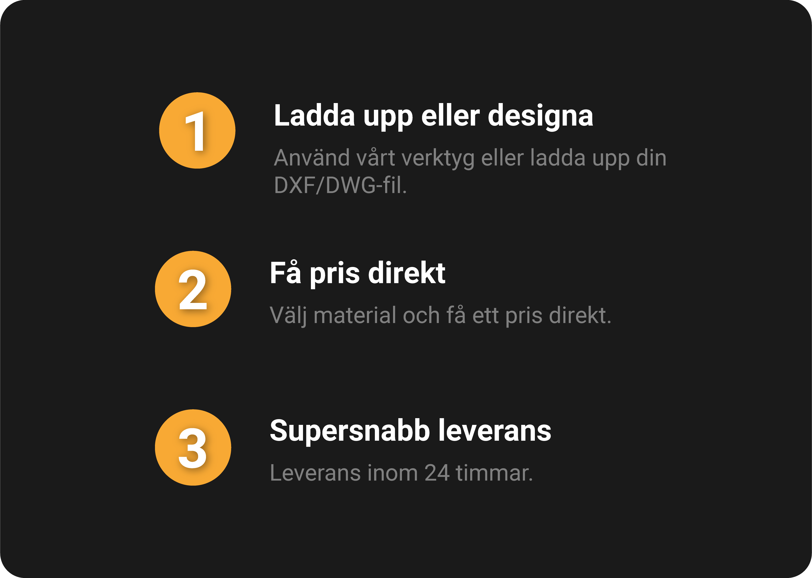 Ladda upp din CAD-fil och få ditt pris direktInga minimiantal – beställ från 1 st